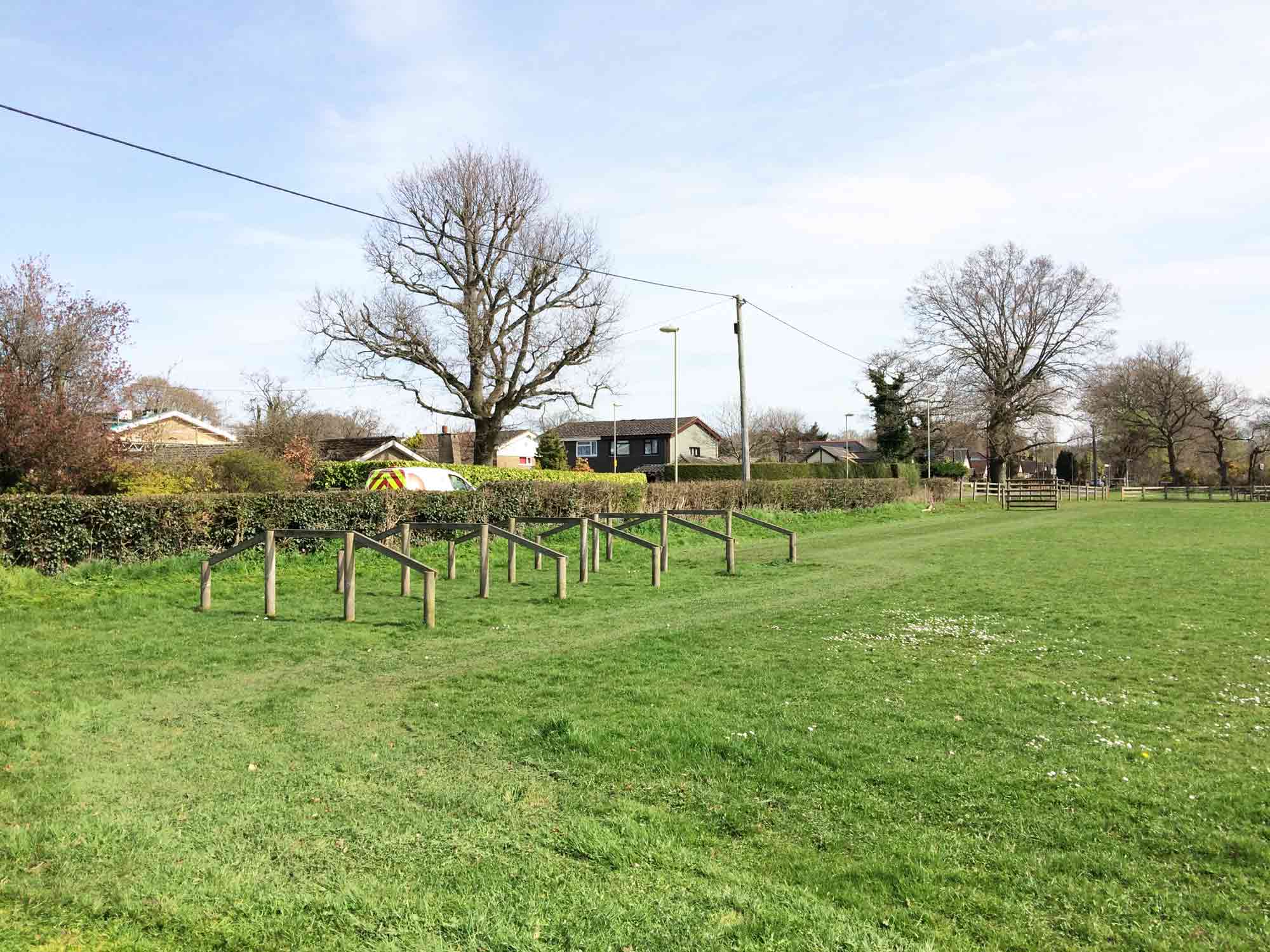 The field by the play area has a fitness trail with equipment such as a ladder, over and under hurdles and parallel bars.