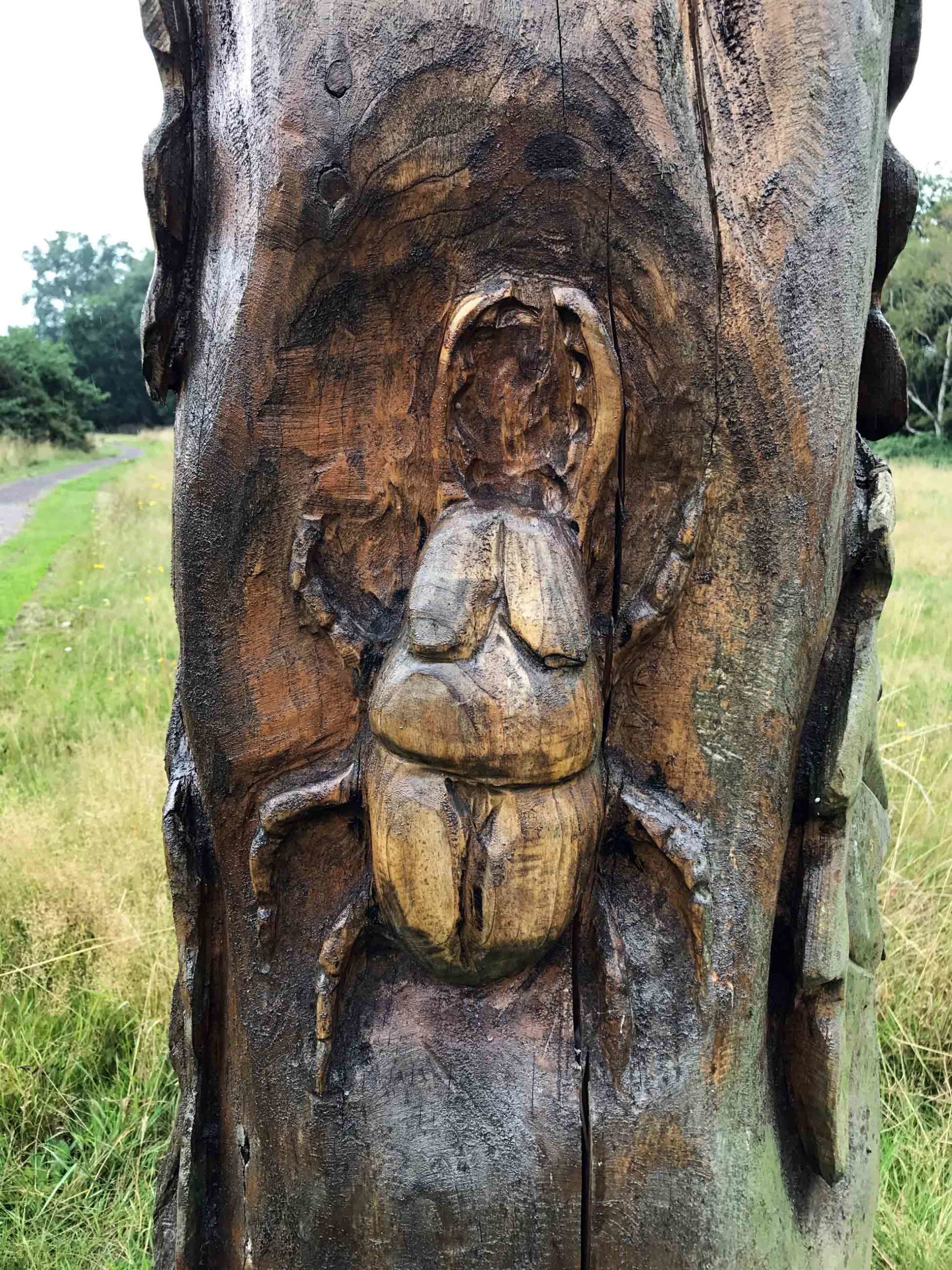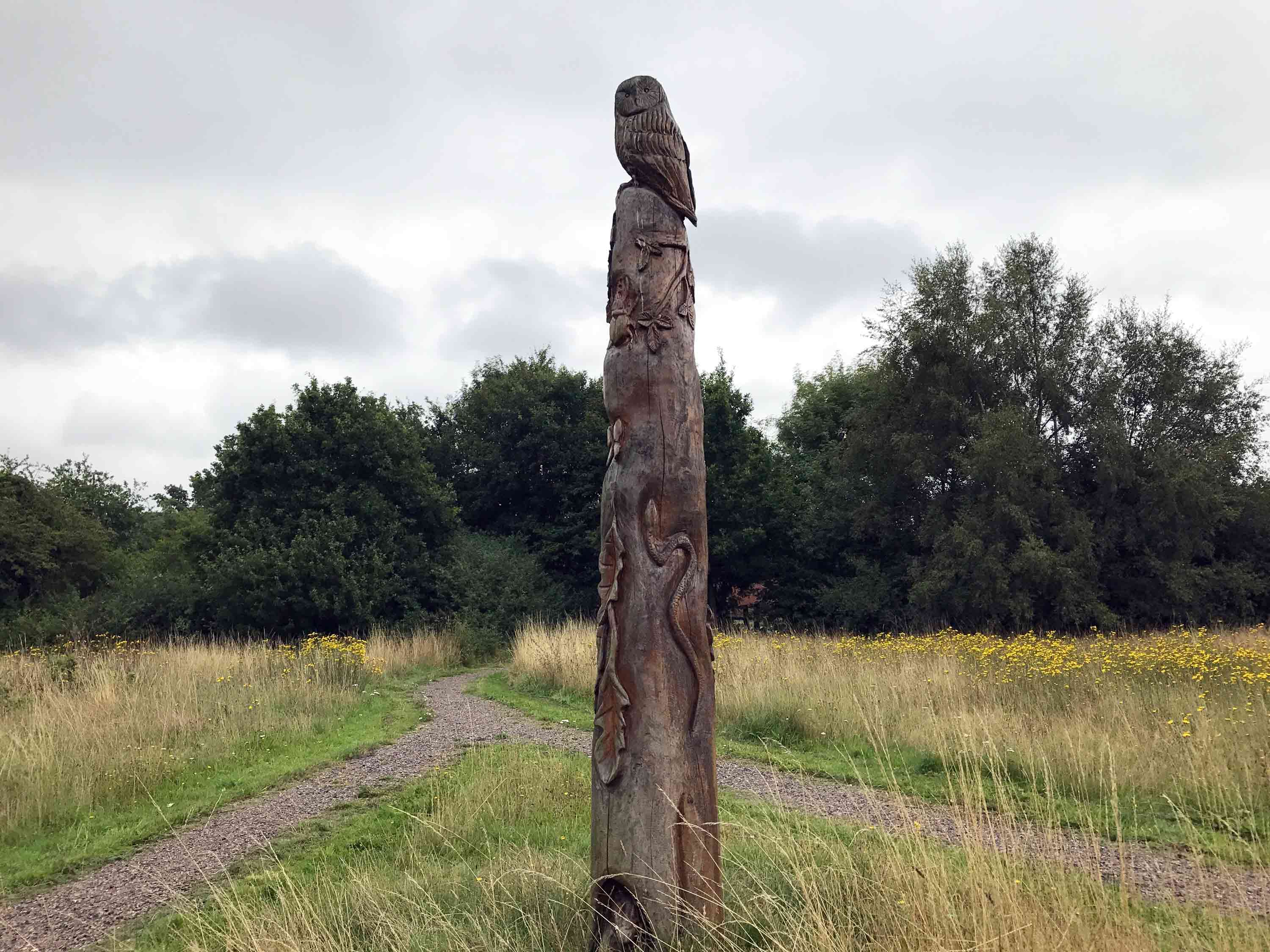 One has wooden sculptures, including a totem pole decorated with wildlife – an owl, beetles, leaves, butterflies, a snake and a badger hiding in a hole at the bottom.