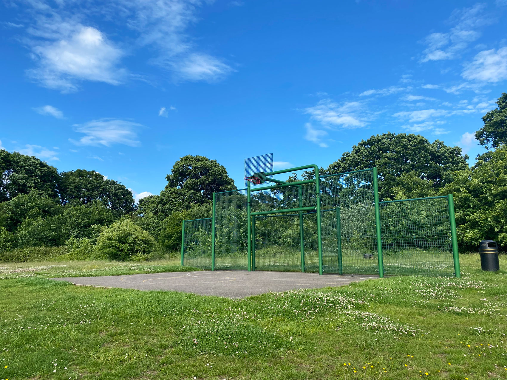 Near the play area is a multi-use games area with a basketball net and a football goal.