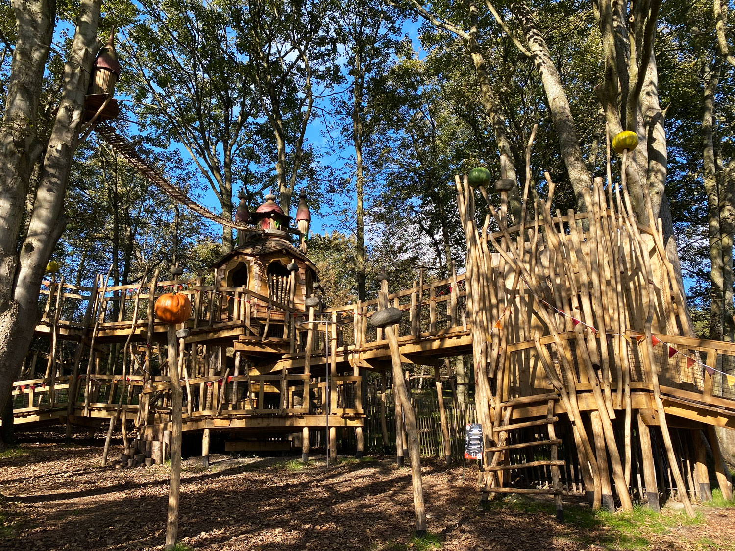 - a huge, two-storey wooden village with climbing walls, nets, tunnels, ladders, rope bridges, wobbly bridges, balancing logs and a fireman’s pole